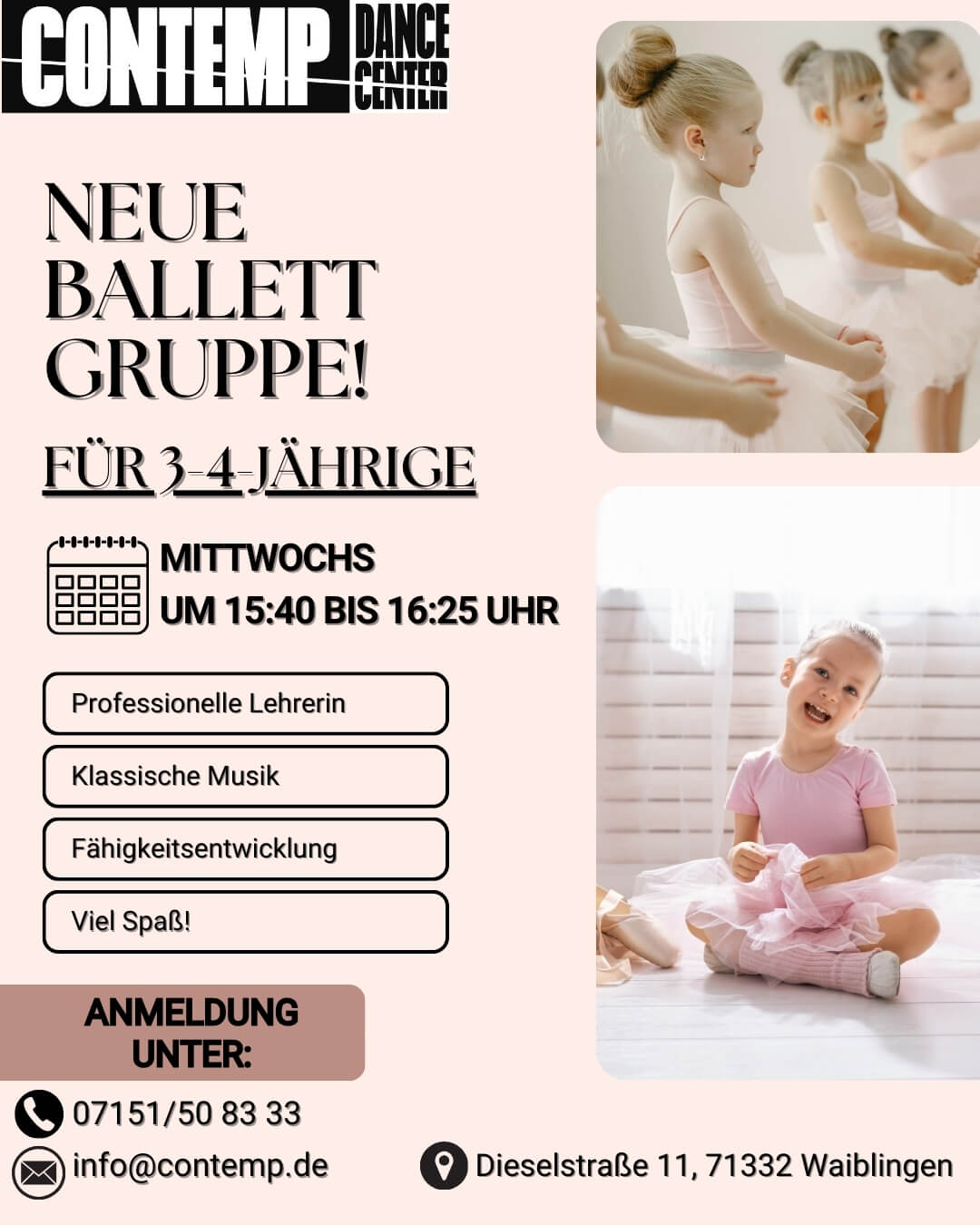 Kinder ab 3 Jahren entdecken bei uns die zauberhafte Welt des Balletts – spielerisch, kreativ und mit viel Freude! 🩰✨ 🎉 Kostenlose Probestunde möglich! 📍 Ort: Dieselstraße 11, 71332 Waiblingen 📧 E-Mail: info@contemp.de 📞 Telefon: 07151 5083333 Melde dich jetzt und lass dein Kind die Magie des Tanzens erleben! ❤️